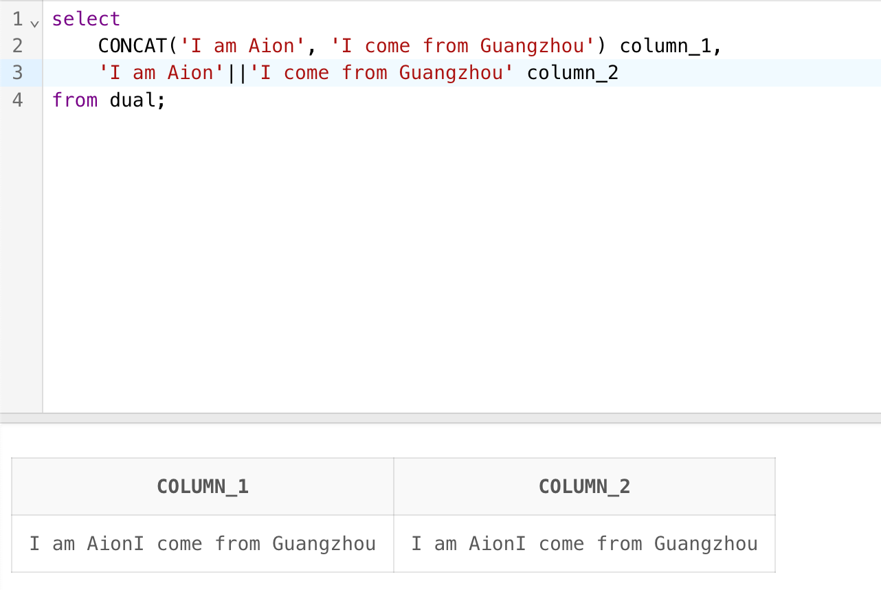 CONCAT('I am Aion', 'I come from Guangzhou') column_1,