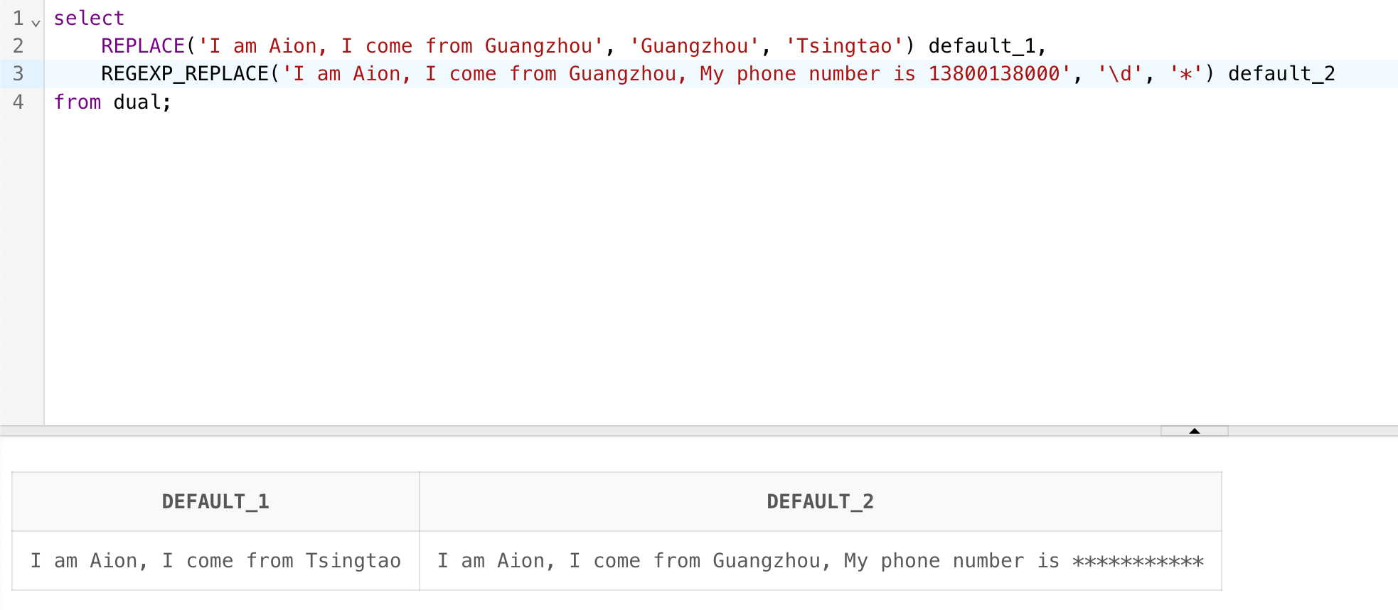 REGEXP_REPLACE('I am Aion, I come from Guangzhou, My phone number is 13800138000', '\d', '*') default_2