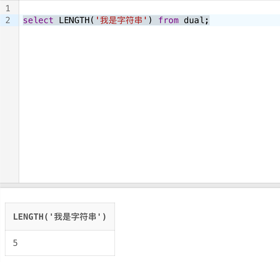 select LENGTH('我是字符串') from dual;