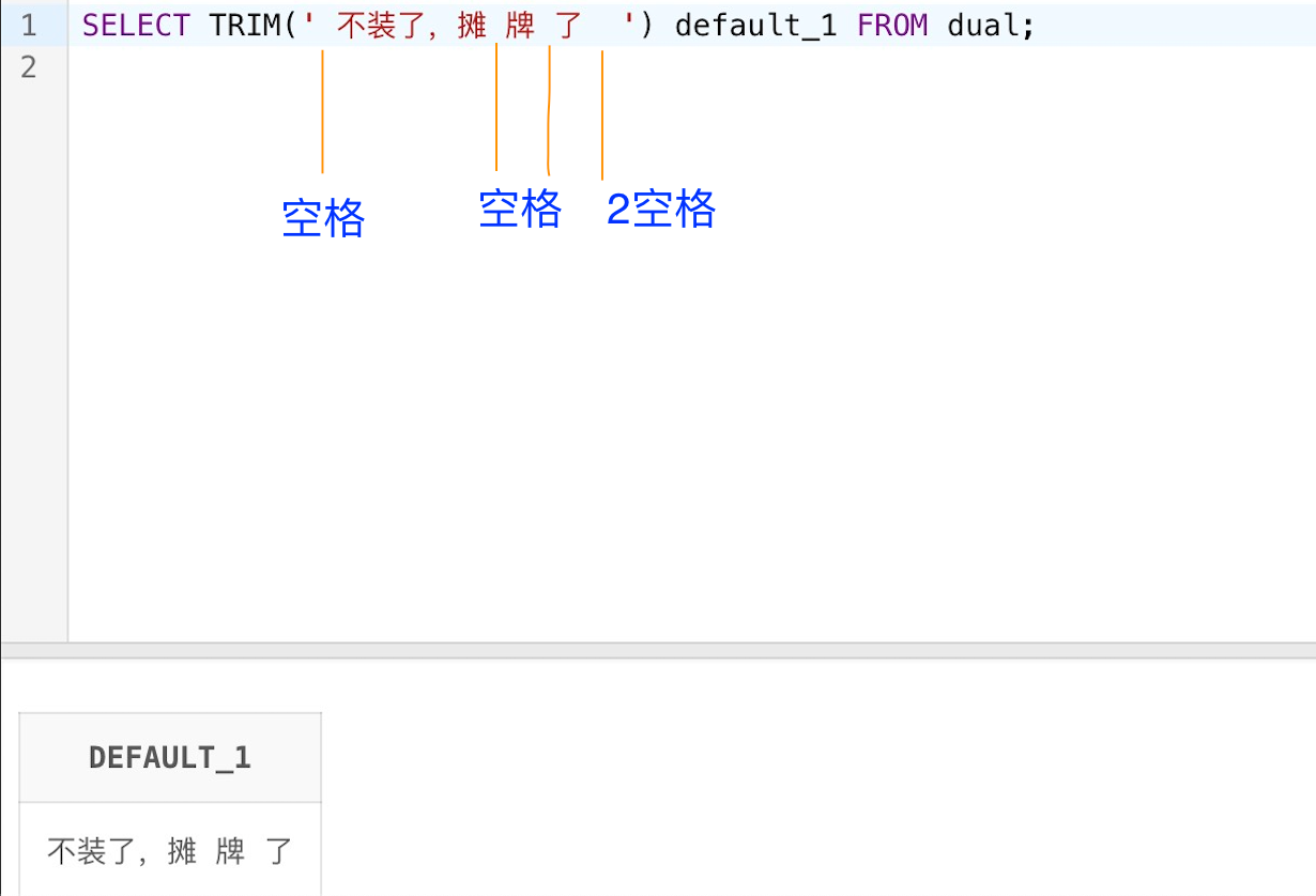 TRIM(both ' ' FROM ' 不装了,摊 牌 了 ') default_4,