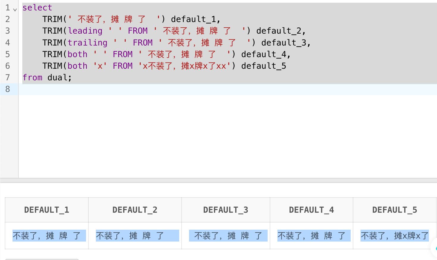 TRIM(leading ' ' FROM ' 不装了,摊 牌 了 ') default_2,