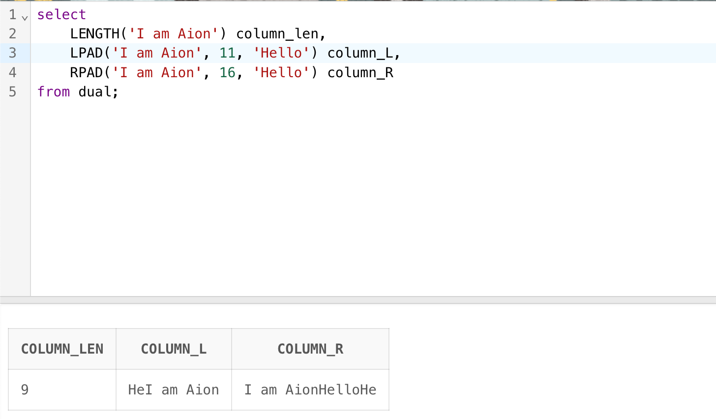 LPAD('I am Aion', 11, 'Hello') column_L,