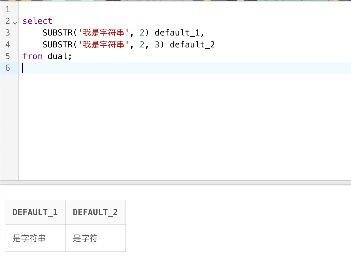 SUBSTR('我是字符串', 2, 3) default_2