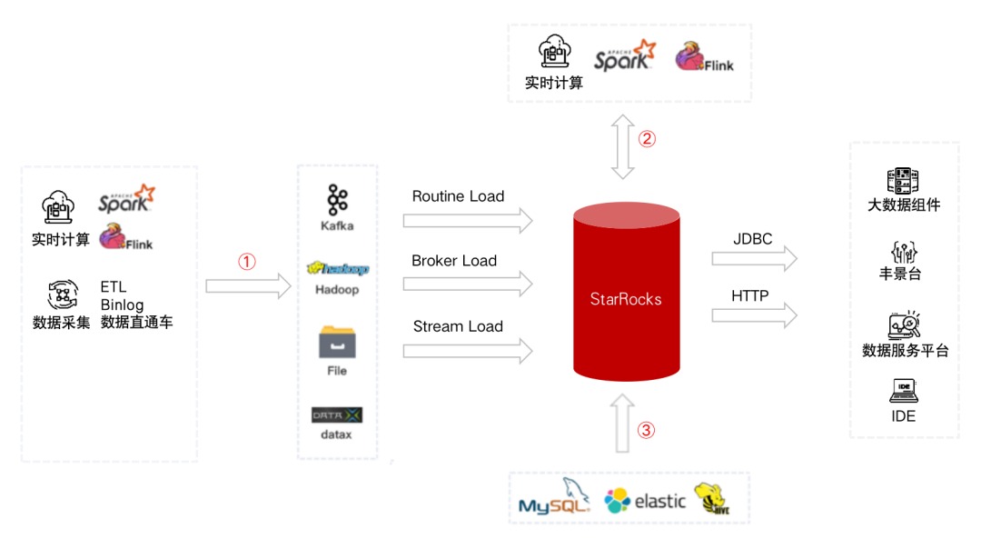 实时数据、离线数据导入,通过 StarRocks 原生的几种 Load 任务完成。 通过 Flink/Spark 的 Connector 完成数据 ETL。 Hadoop、Elasticsearch、MySQL 等环境中的数据,作为数据源,通过 StarRocks 外表导入。