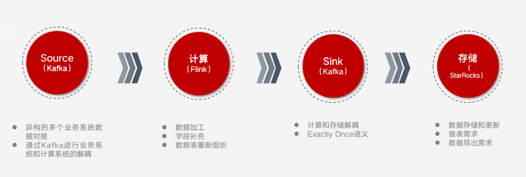 目前系统的整体数据来源于多个业务系统,通过 Flink 进行计算后写入一个新的 Kafka ,StarRock 通过 Routine Load 从新的 Kafka 拉取数据,很好的实现了 Exactly Once 语义,各个系统的耦合度很低,可用度高。