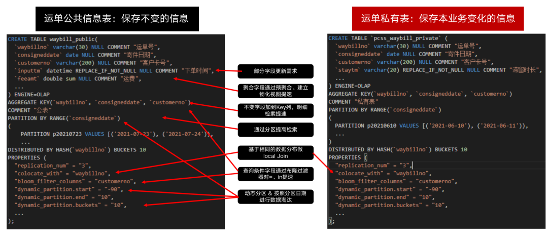 表设计按照日期分区,按照运单号分桶,第一个问题就是如何进行数据分布的设计,从使用经验来看,Kafka 分区个数与 StarRocks 的 BE 节点个数、导数任务并行度要一致,导入效率才最高。 由于源头数据来源于不同的业务系统加工成大宽表,需要通过配置字段的 replace_if_not_null 支持部分字段更新,另外为了避免 Json 数据字段增删导致导数失败,需要每个字段指定 Json 位置。 StarRocks 导入能力与单条记录的字节数、合并效率有很大关系。为了更高的导入性能,我们把大宽表的按列分拆为两个,更新少的数据放入一个表(这里叫公表)、更新频繁的放到另外一个表(私表),多表的导入的任务数会增加。 机器选型上,由于写入频繁,我们升级了单机 6 盘到 12 盘,未来考虑使用 ssd;StarRocks 向量化优化深入,我们升级了 40 核到 80 核,提升 QPS。 系统按照日期进行分区,由于数据来源于多个业务系统,存在分区时间没有的情况,需要反查,初期方案是从 StarRocks 跨区查,效率较低,后面采用了 Flink 的 RocksDB 方案。 跨机器跨磁盘的副本均衡问题:由于机器 down 机或者增删磁盘造成的,目前跨机器的副本均衡已经在最新版本解决,跨磁盘的副本均衡期待在后续版本解决。 版本数问题:如果版本数过多会导致 BE 节点暂停从 Kafka 消费,导致数据导入效率下降。这里可以通过调整 Kafka 消费时间、合理设置分片、分区个数、副本个数减少版本数。