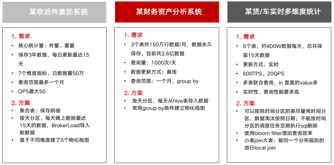 在适应性更高的场景、如不更新、数据量10亿以下等,StarRocks 更加得心应手,性能强大。这里是目前顺丰接入的其他一些非运单明细的场景,StarRocks 都有良好表现,如原财务系统,时常会出现告警。接入 StarRocks 以后,使用1/3的资源消耗即可良好的运行。