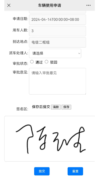 可通过电脑或手机进行处理,如下图,选择下一个节点处理人,审批状态,在签名区进行签名,可通过清除按钮进行清除重新签名,签名完毕后点击保存,下方显示签名图片即可进行提交。