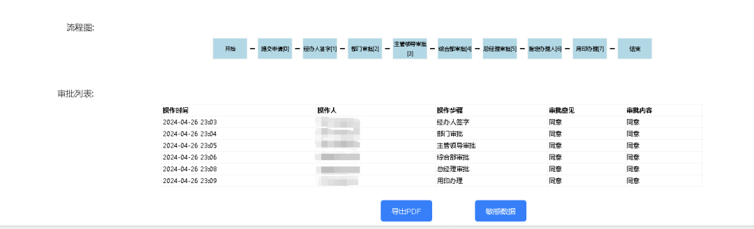 流程完成后即可通过列表的查看进行该工单的信息查看,并通过最下方的“导出pdf”实现pdf签字版的文档导出。