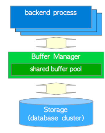 缓冲管理器:主要是管理共享内存和持久存储之间的数据传输,并可能对 DBMS 的性能产生重大影响。缓冲区管理器、持久存储和后端进程之间的关系如下图所示: