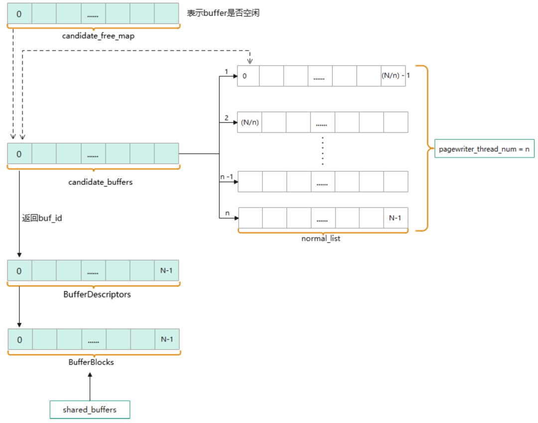 candidate_buffer(候选buffer队列,全部可用(或在用)缓冲区槽位数组):数据类型:数组 key: 0~(N-1) value:buf_id,长度等同于buffer缓冲池的槽位数 normal_list(空闲buffer队列):数据类型:CandidateList类型链表, size: shared_buffers_num pagewriter_thread_num, value:buf_id candidate_free_map(候选队列中buffer空闲状态标记表):数据类型:数组 key: buf_id value:true/false,长度等同于buffer缓冲池的槽位数 candidate_buffer候选队列和缓冲区、缓冲区描述的关系如下: