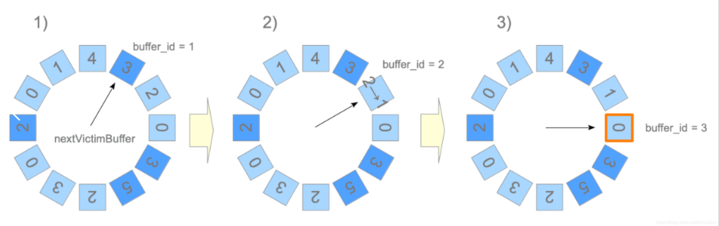 每次要通过时钟替换算法选出受害者时,时钟手会在不停在所有缓冲区描述符中轮转,如果一个选中描述符的usage_count = 0,则选中该buffer为受害者,否则usage_count--。