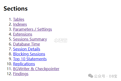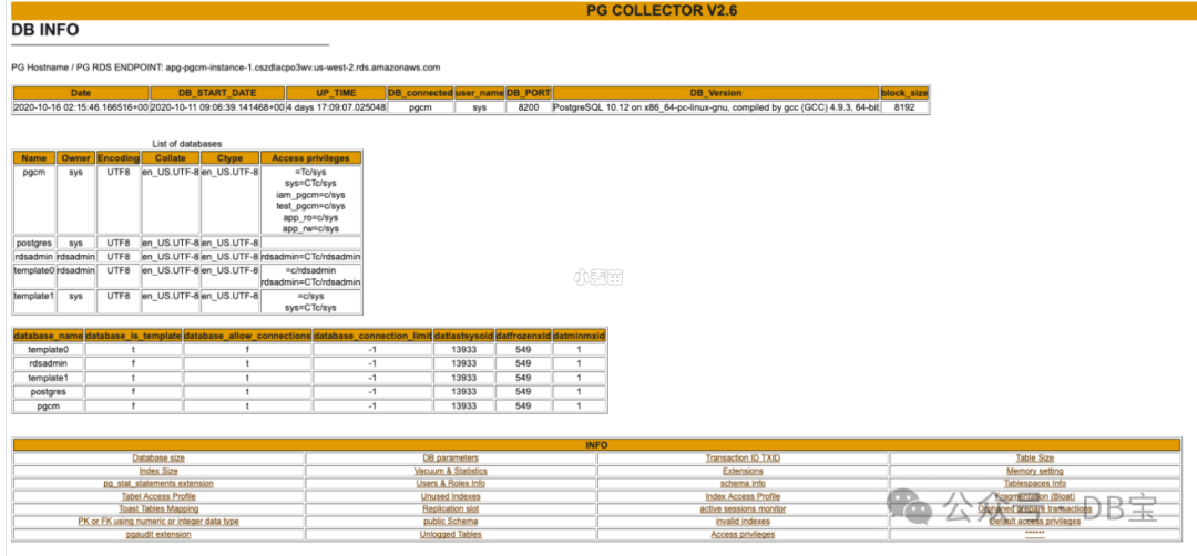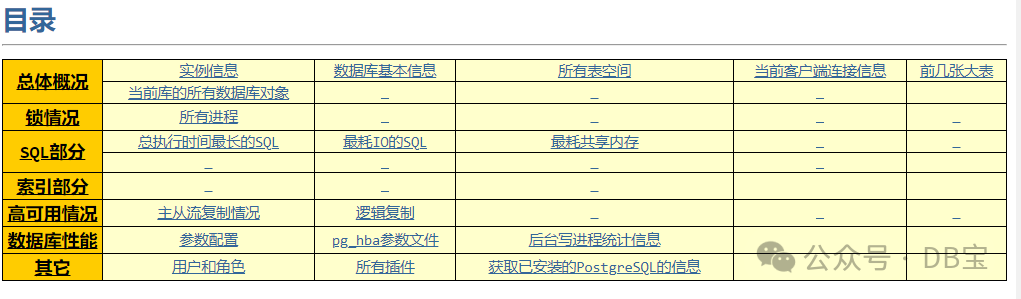| GitHub地址 | https://github.com/dbbao/dbhealthcheck | https://github.com/jobinau/pg_gather | https://github.com/awslabs/pg-collector |