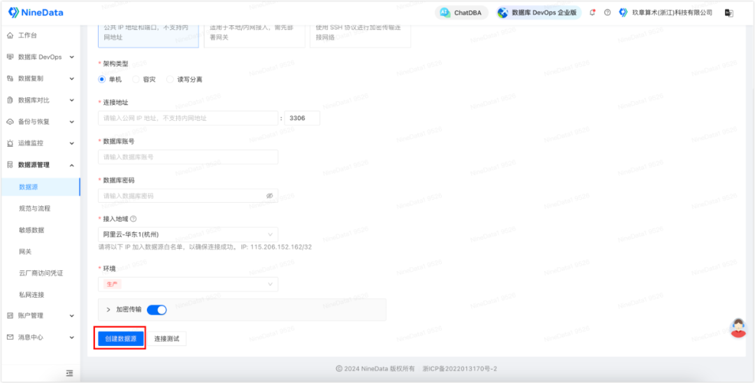 1. 登录 NineData 控制台,单击数据源管理>数据源,然后在页面中单击创建数据源,选择需要录入的数据源。