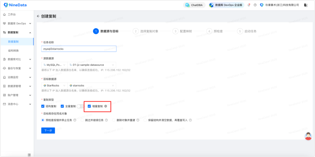 2. 根据页面提示配置复制任务,由于我们想要实现长期的实时数据同步,需要在复制类型处额外勾选增量复制。