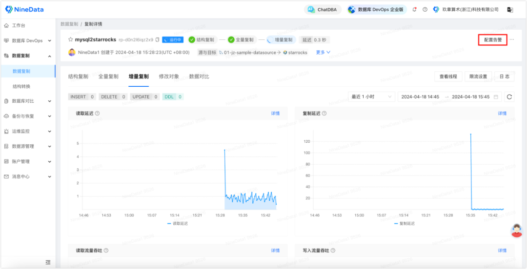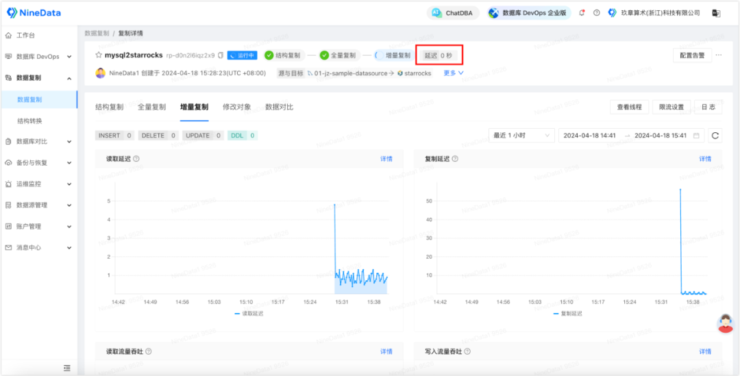 3. 配置完成后启动任务,针对您配置的所有同步对象,NineData 会先对所有的存量数据进行全量迁移,接下来就是实时同步 MySQL 中新增的增量数据,所有新写入的数据都将一条不漏地同步到 StarRocks,每当目标端的增量数据追平源端时,任务面板中会显示延迟 0 秒,代表当前 StarRocks 中的数据是最新的。