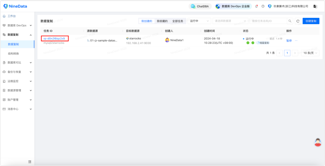 1. 登录 NineData 控制台,单击数据复制>数据复制,然后单击步骤二中创建的复制任务 ID。
