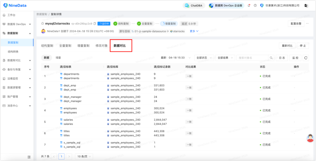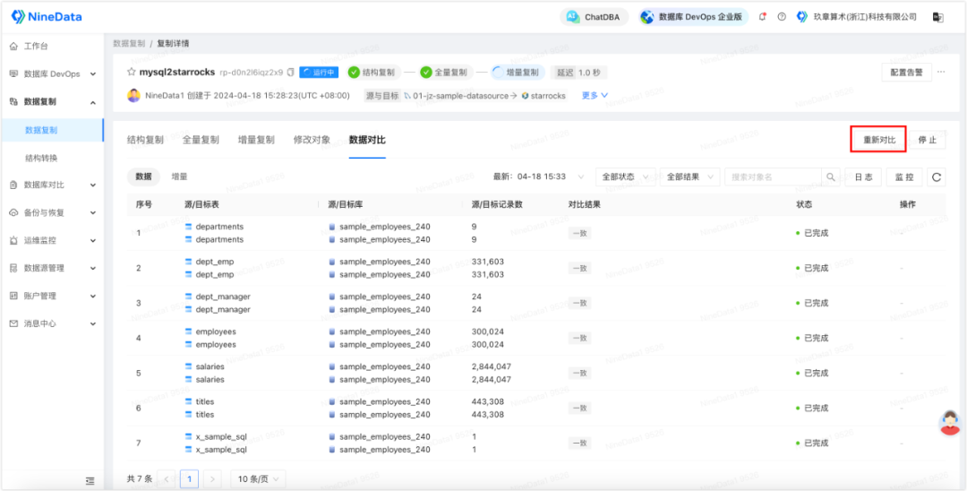 除了同步功能以外,NineData 还提供了同步后源端和目标端同步数据的对比功能,以确保目标端数据的完整性。