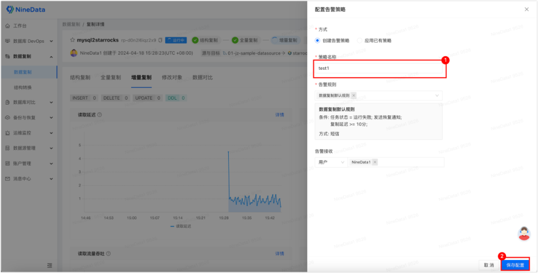 3. 输入策略名称,单击保存配置即可。您可以直接使用内置的默认规则,在任务运行失败,或复制延迟大于等于 10 分钟的时候,发送短信提醒您。您也可以自定义创建规则,根据您的需求来进行通知。