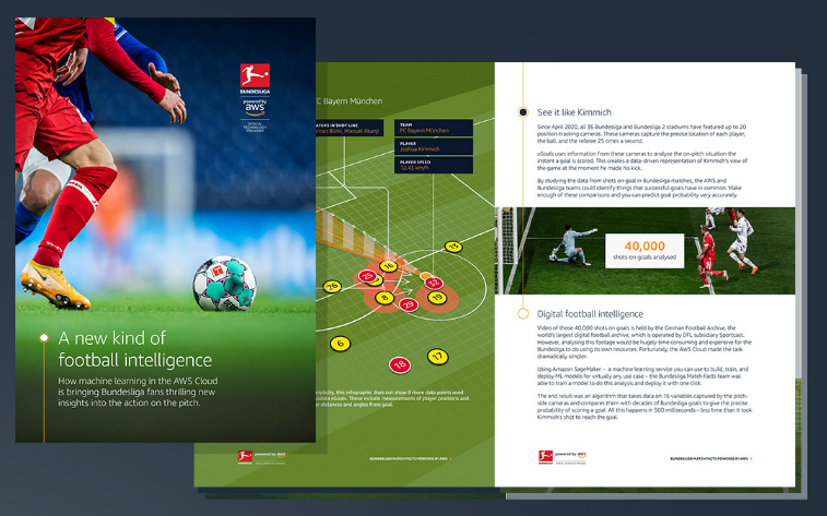 德甲联赛与亚马逊云科技的合作可以追溯到2020年,他们将体育、媒体、数据分析、机器学习(ML)和人工智能(AI)方面的专业知识结合在一起,建立了足球联赛与科技公司之间深入且广泛的合作关系。许多成功项目已经执行,例如,开发由亚马逊云科技提供技术支持的德甲比赛数据,已经发展成为一个基于官方的现场比赛数据的实时高级分析产品组合,通过引入最受压制球员、进攻区域以及平均站位变化趋势等统计数据,更好地展示球场上的动态,为球迷、教练、球员和媒体评论员分析球队决策提供视觉支持。