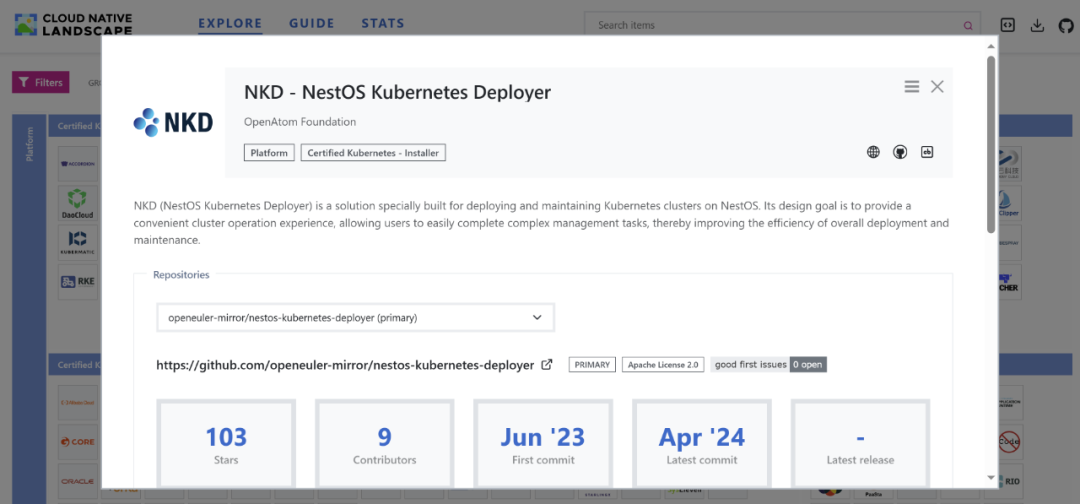 此次加入 CNCF Landscape,极大促进openEuler孵化项目NKD的推广及合作,吸引广大云原生企业用户深度参与,NKD将持续在容器领域发挥越来越重要的作用,openEuler 也将在云原生领域持续耕耘、持续引领创新、繁荣生态,助力各行业走向快速智能发展之路。未来openEuler将持续参与社区云原生项目孵化,丰富整个云原生开源社区生态。