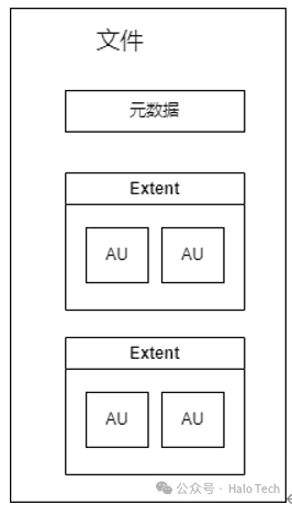 文件中包含元数据和多个extent, 每个extent包含1个或多个AU。