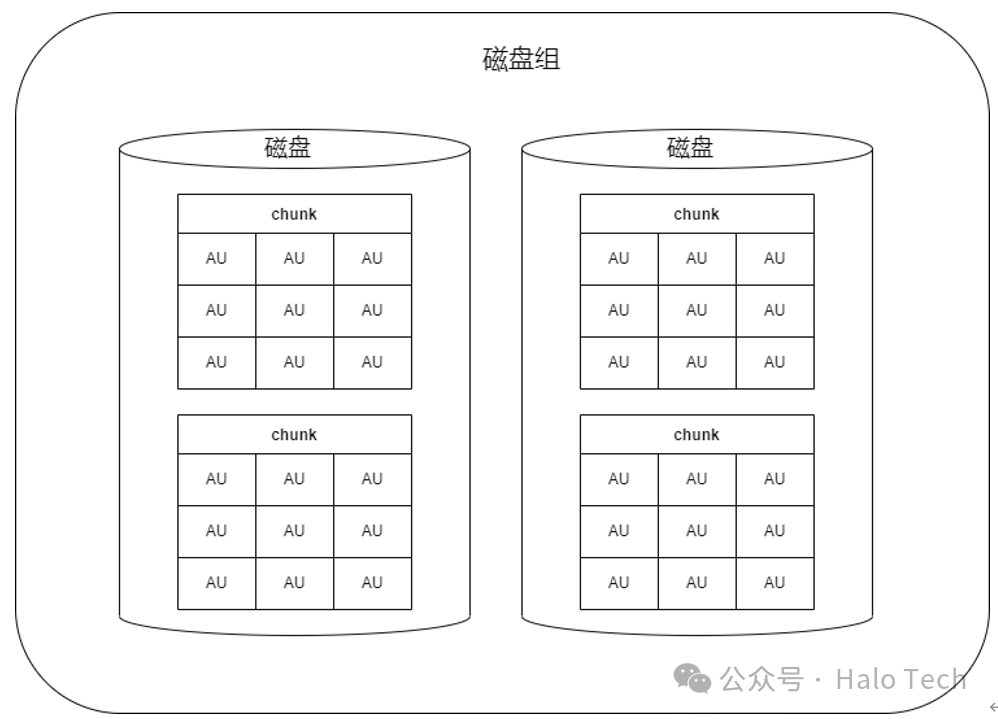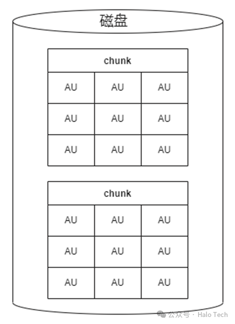 每块磁盘里面分为多个chunk,每个chunk里有多个AU。因为磁盘大小不等,分配表AT保存在一个AU中,所以chunk里能包含多少AU由AT表能管理多少个AU决定。