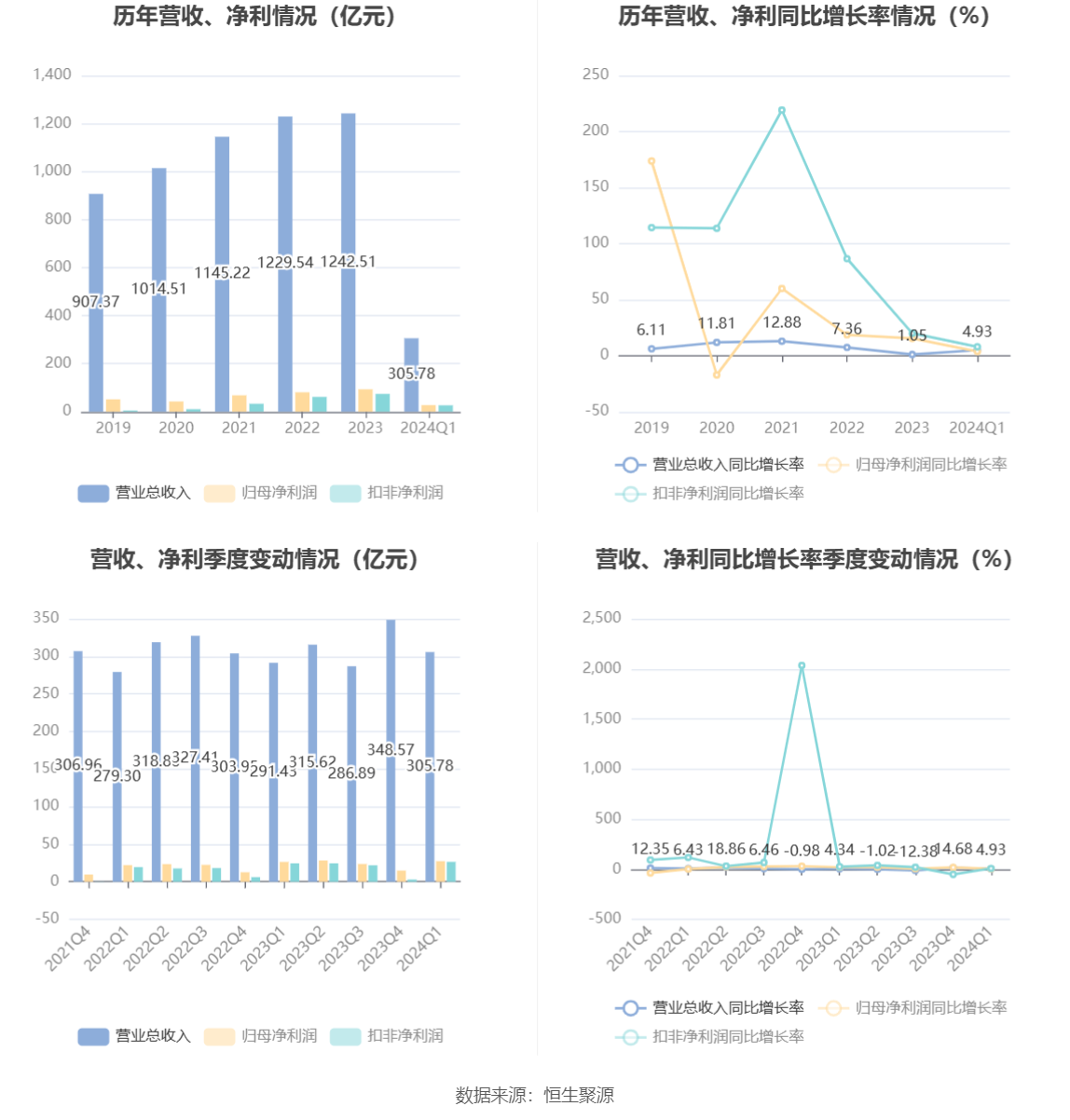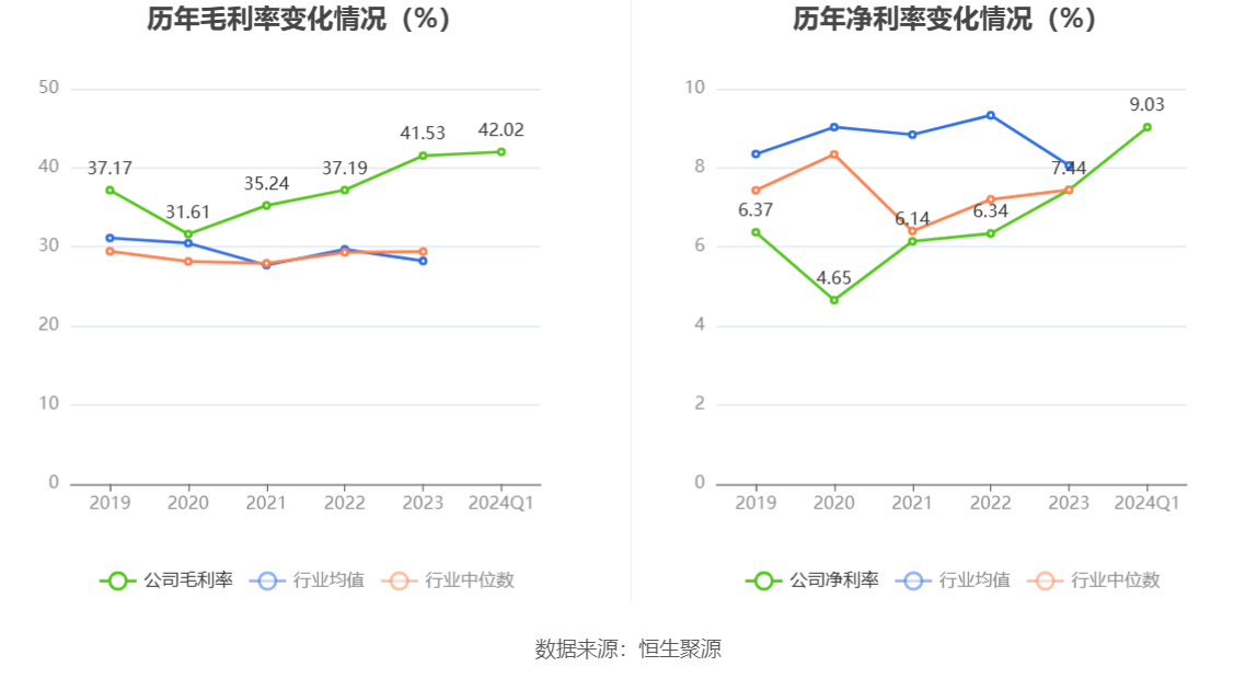 2024年第一季度,公司毛利率为42.02%,同比下降2.47个百分点;净利率为9.03%,较上年同期上升0.06个百分点。