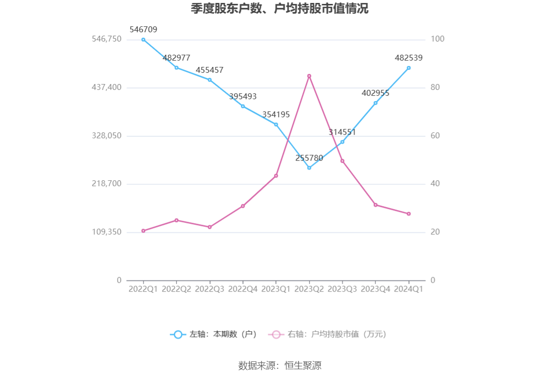 筹码集中度方面,截至2024年一季度末,公司股东总户数为48.25万户,较上年末增长了7.96万户,增幅19.75%;户均持股市值由上年末的31.41万元下降至27.73万元,降幅为11.72%。