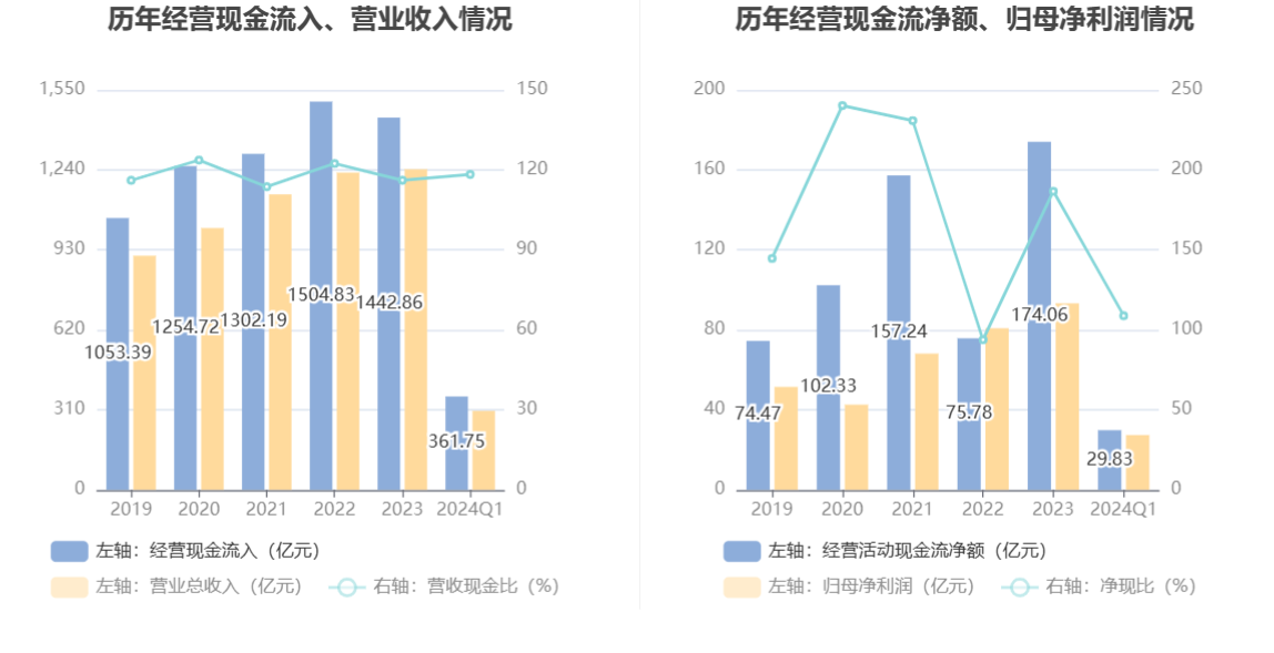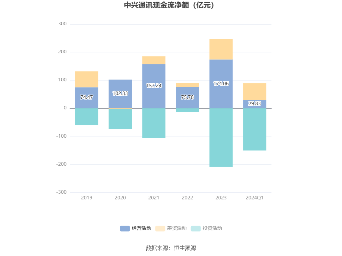 2024年第一季度,公司经营活动现金流净额为29.83亿元,同比增长28.25%;筹资活动现金流净额59.59亿元,同比增加4.42亿元;投资活动现金流净额-150.61亿元,上年同期为-50.84亿元。
