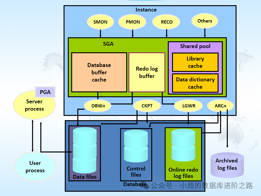 DBWR:将 db_buffer_cache 中的脏块写回到数据文件,可以有多个进程