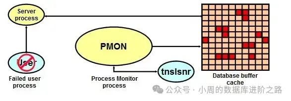PMON:当一个会话意外断开后,残留在系统中的垃圾,比如锁信息,服务进程等,从dbf中读取数据块到db-buffer-cache,向监听告知当前实例的信息,称之为动态注册,会在启动时,以及相关参数变更时,1分钟一次的条件达成而触发,监听只有知道实例的存在才能为用户建立连接