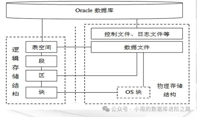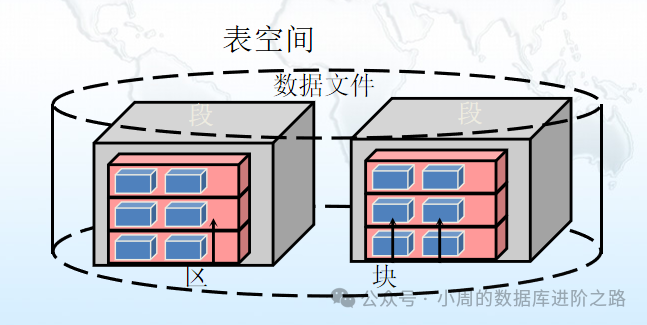 一个数据库是由多个表空间构成、一个表空间由一个或多个数据文件组成 、一个数据文件由一个或多个区组成 、一个段由一个或多个区构成、一个区由多个连续的oracle数据块组成。