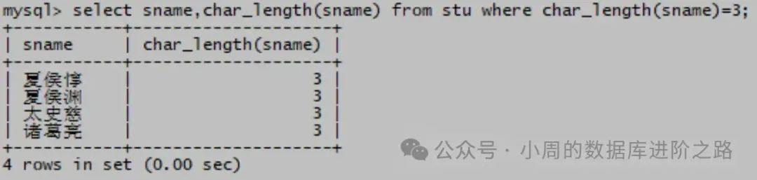 mysql> select sname,char_length(sname) from stu where char_length(sname)=3;