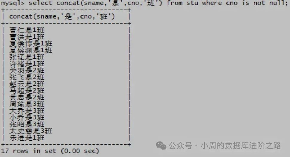 mysql> select concat(sname,‘是’,cno,‘班’) from stu where cno is not null;