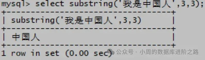 mysql> select substring(‘我是中国人’,3,3);