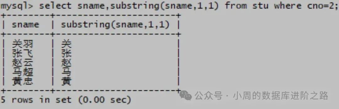 mysql> select sname,substring(sname,1,1) from stu where cno=2;
