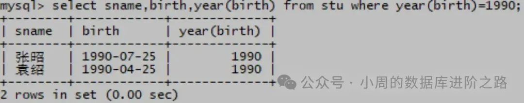 mysql> select sname,birth,year(birth) from stu where year(birth)=1990;