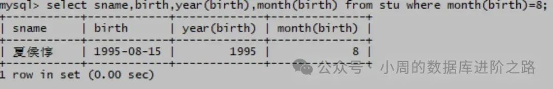 mysql> select sname,birth,year(birth),month(birth) from stu where month(birth)=8;