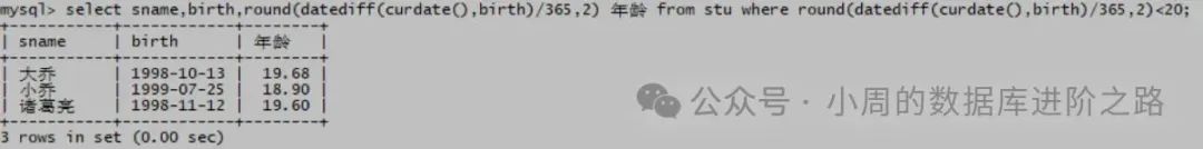 mysql> select sname,birth,round(datediff(curdate(),birth)/365,2) 年龄 from stu where round(datediff(curdate(),birth)/365,2)<20;