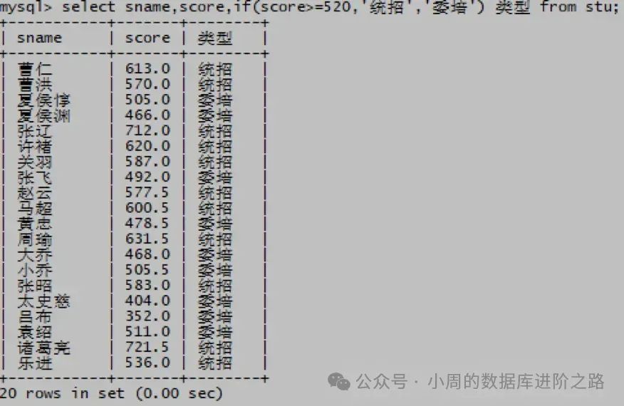 mysql> select sname,score,if(score>=520,‘统招’,‘委培’) 类型 from stu;