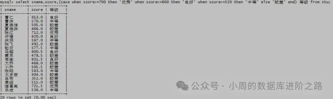 mysql> select sname,score,(case when score>=700 then ‘优秀’ when score>=600 then ‘良好’ when score>=520 then ‘中等’ else ‘较差’ end) 等级 from stu;