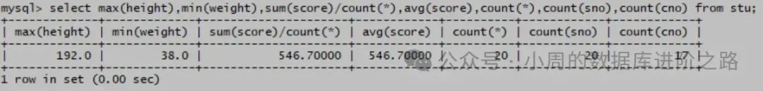 mysql> select max(height),min(weight),sum(score)/count(),avg(score),count(),count(sno),count(cno) from stu;