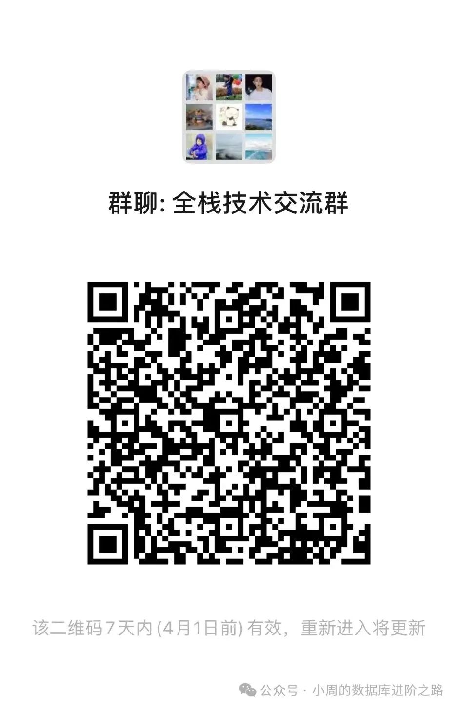 欢迎关注公众号:小周的数据库进阶之路,一起交流数据库、中间件和云计算等技术。欢迎觉得读完本文有收获,可以转发给其他朋友,大家一起学习进步!感兴趣的朋友可以扫描下面的二维码加入群聊,与业界的大佬们一起交流学习。