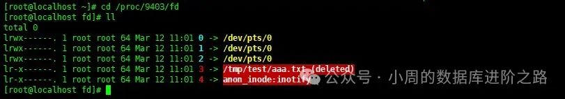 此时的状态为终端一仍在占用进程,终端二中把文件删除掉了。