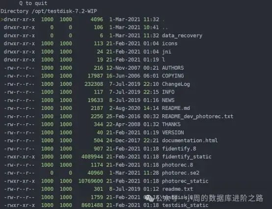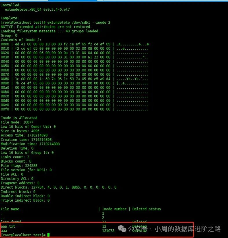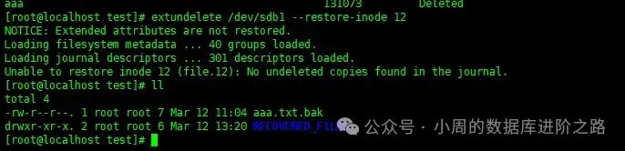 开始恢复文件,找到我们需要恢复文件的Inode number,比如我这里图示为12,则执行以下命令,执行后,会在当前目录下生成RECOVERED_FILES目录,里面包含我们恢复的文件: