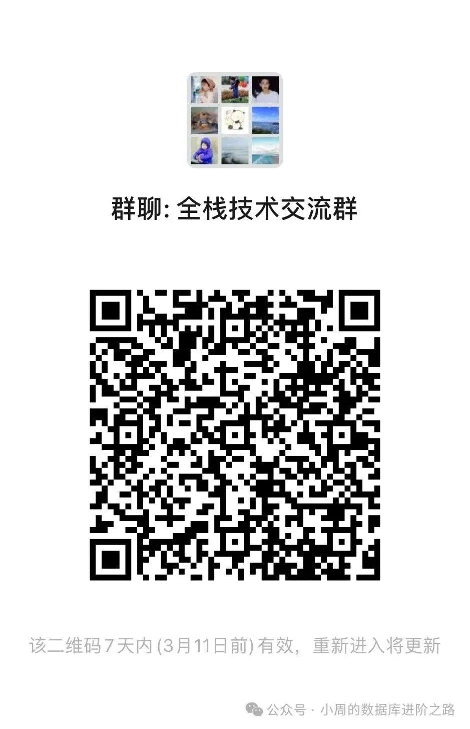 欢迎关注公众号:小周的数据库进阶之路,一起交流数据库、中间件和云计算等技术。欢迎觉得读完本文有收获,可以转发给其他朋友,大家一起学习进步!感兴趣的朋友可以扫描下面的二维码加入群聊,与业界的大佬们一起交流学习。