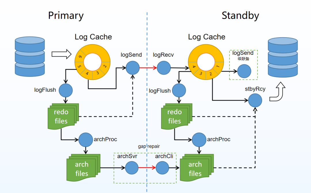 archSvr:归档发送线程。当备库请求归档日志时,主库将归档日志发送到对端。