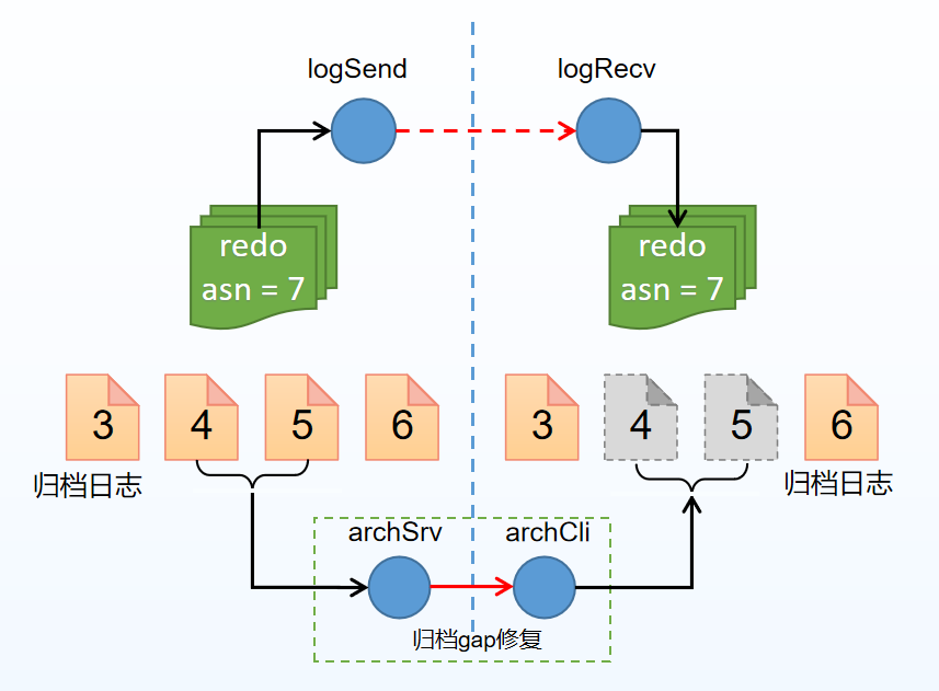 YashanDB的备库重连后,直接从主库日志缓存接收最新Redo,其余未接收到的Redo,将通过归档日志拉取线程补齐,这部分归档称为归档GAP。