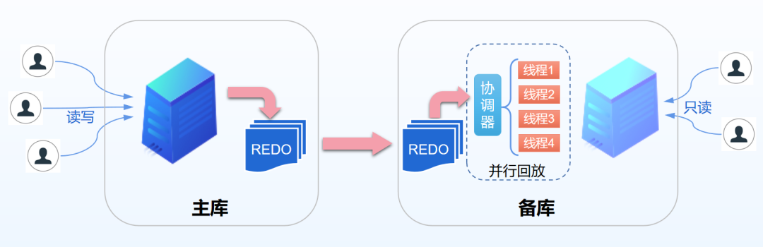 备库通过一个协调线程读取和分析Redo日志,然后将Redo按照会话ID哈希分配给后台回放线程,让这些后台线程并行回放Redo。